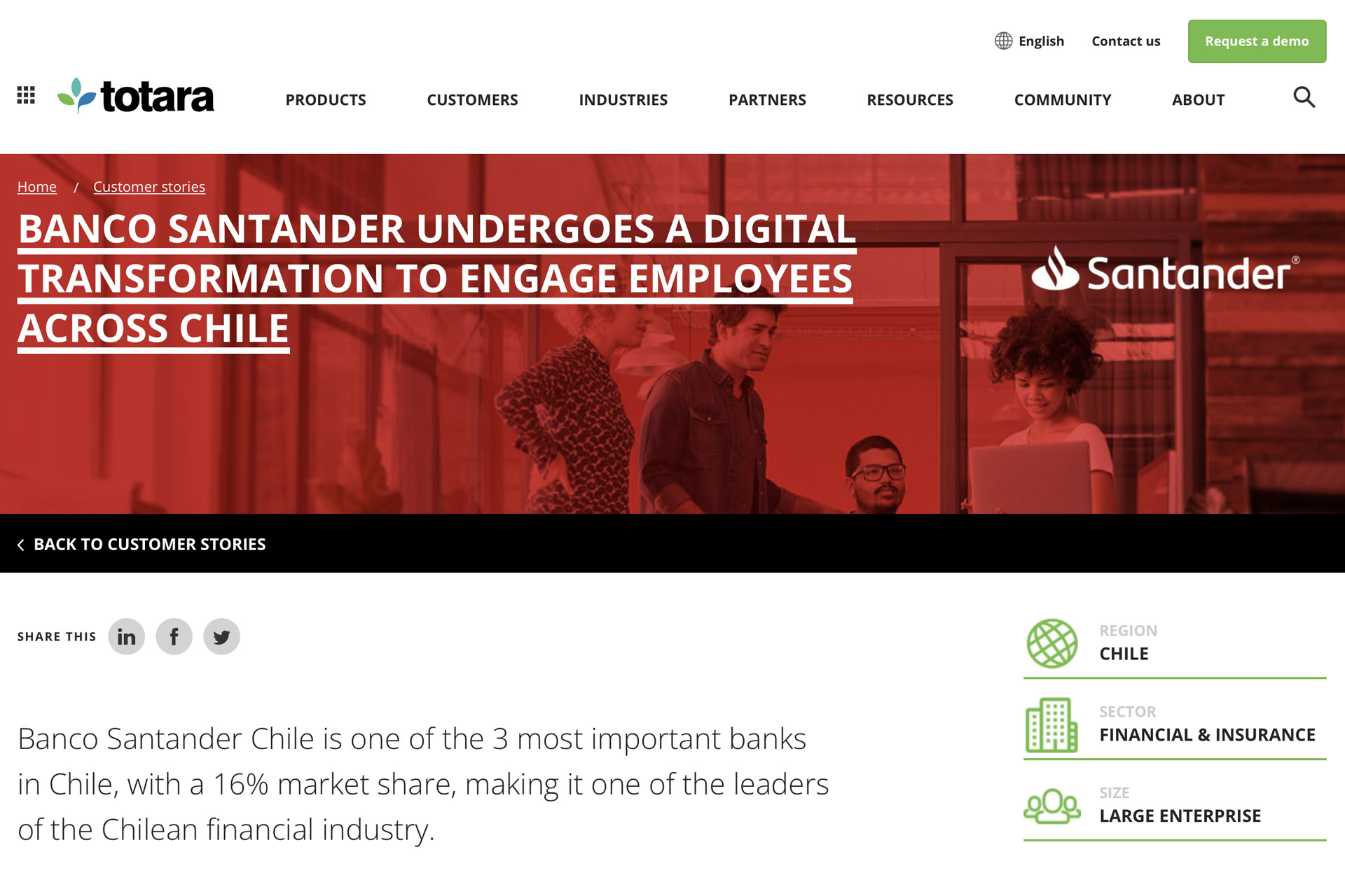 Glow Chile implementó Totara Learn con Banco Santander, permitiendo que esto resolviera los objetivos planteados por la Subgerencia de Aprendizaje y Conocimiento del banco. Entre los objetivos estaba provocar un alto grado de participación en cursos on line, haciendo que los usuarios pudieran sentir que la plataforma es una real herramienta de apoyo en sus procesos de entrenamiento y desarrollo. Pudiendo aprender de una manera distinta, visualmente entretenida, siempre cuidando la experiencia de usuario de los colaboradores, tratando de cautivar a través de un formato tipo serie de películas los diferentes recursos formativos.